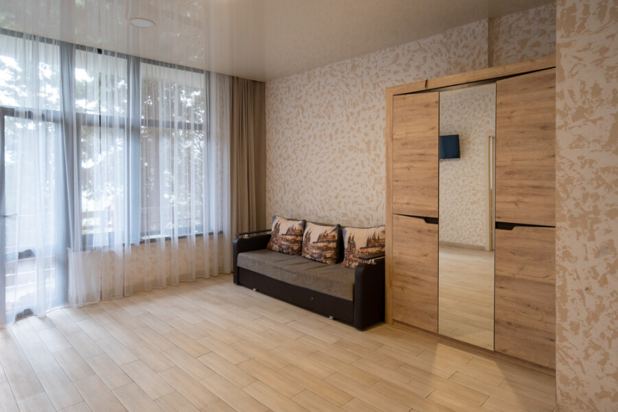 - Мебель: вешалка, диван, зеркало, кровать двуспальная, прикроватные тумбочки, шкаф